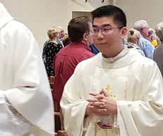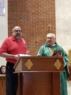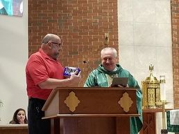 Grand Knight Mark Ochalek presents Fr. Mark Wajda the Council's plaque of appreciation as our Worthy Chaplain 2015-2019.